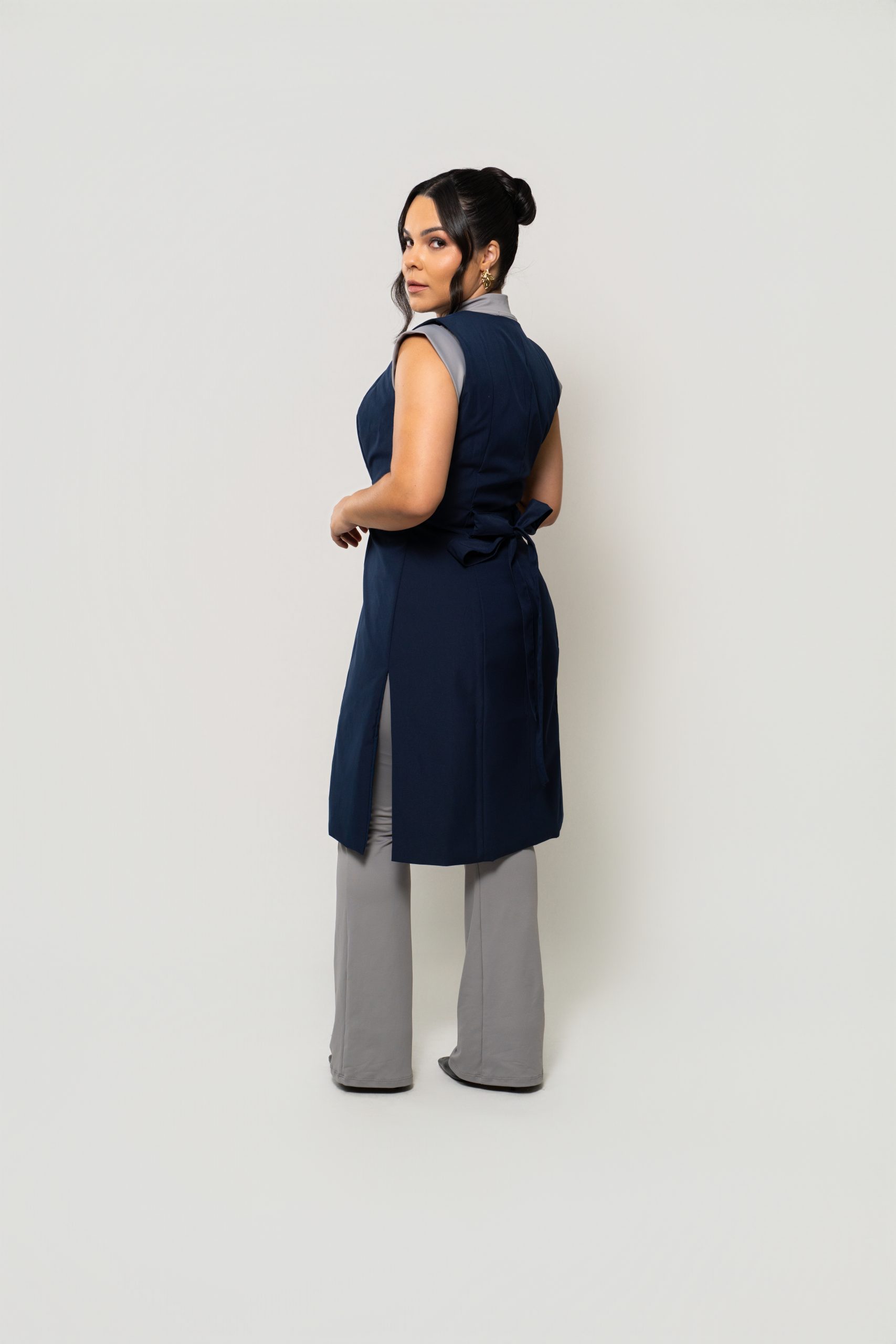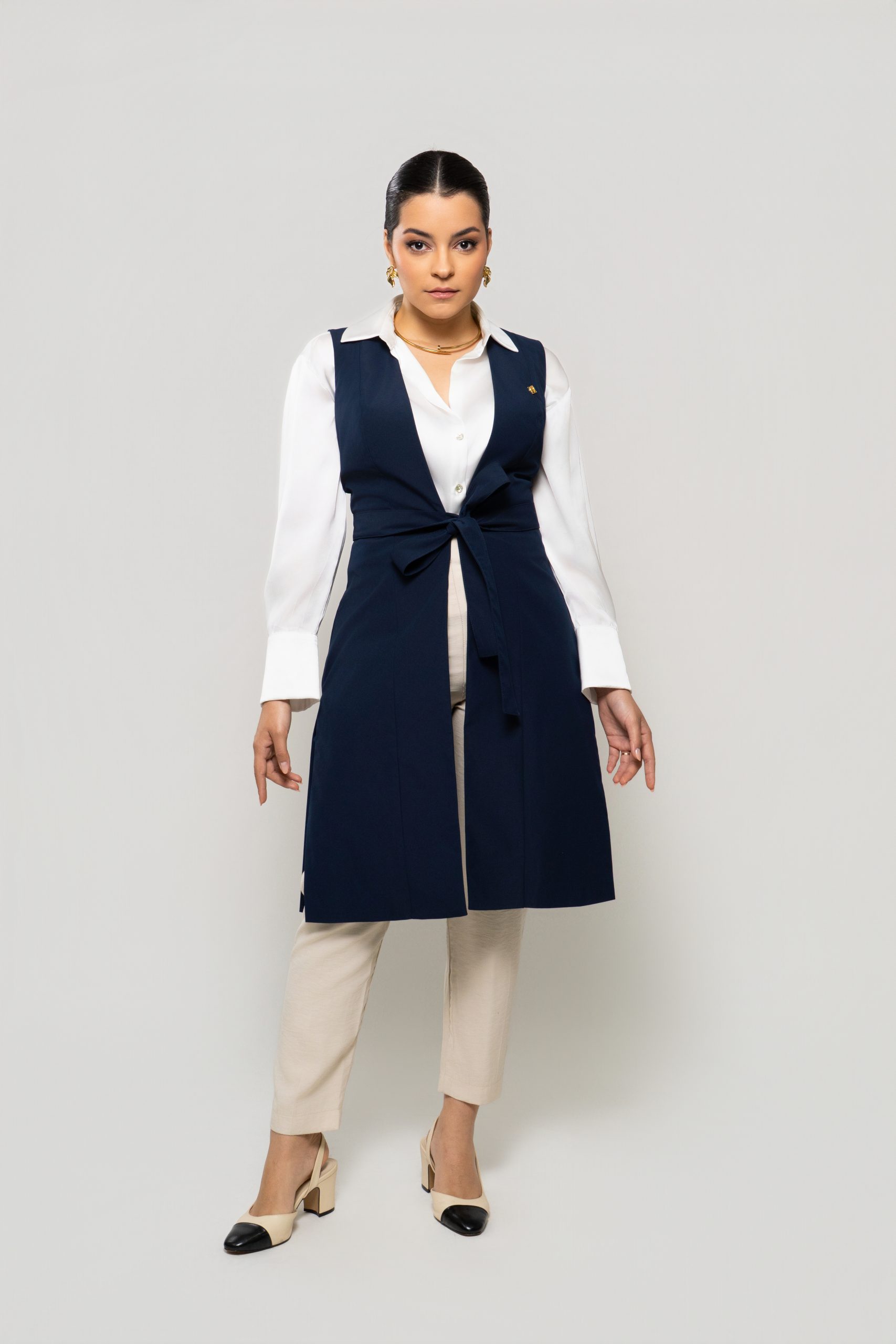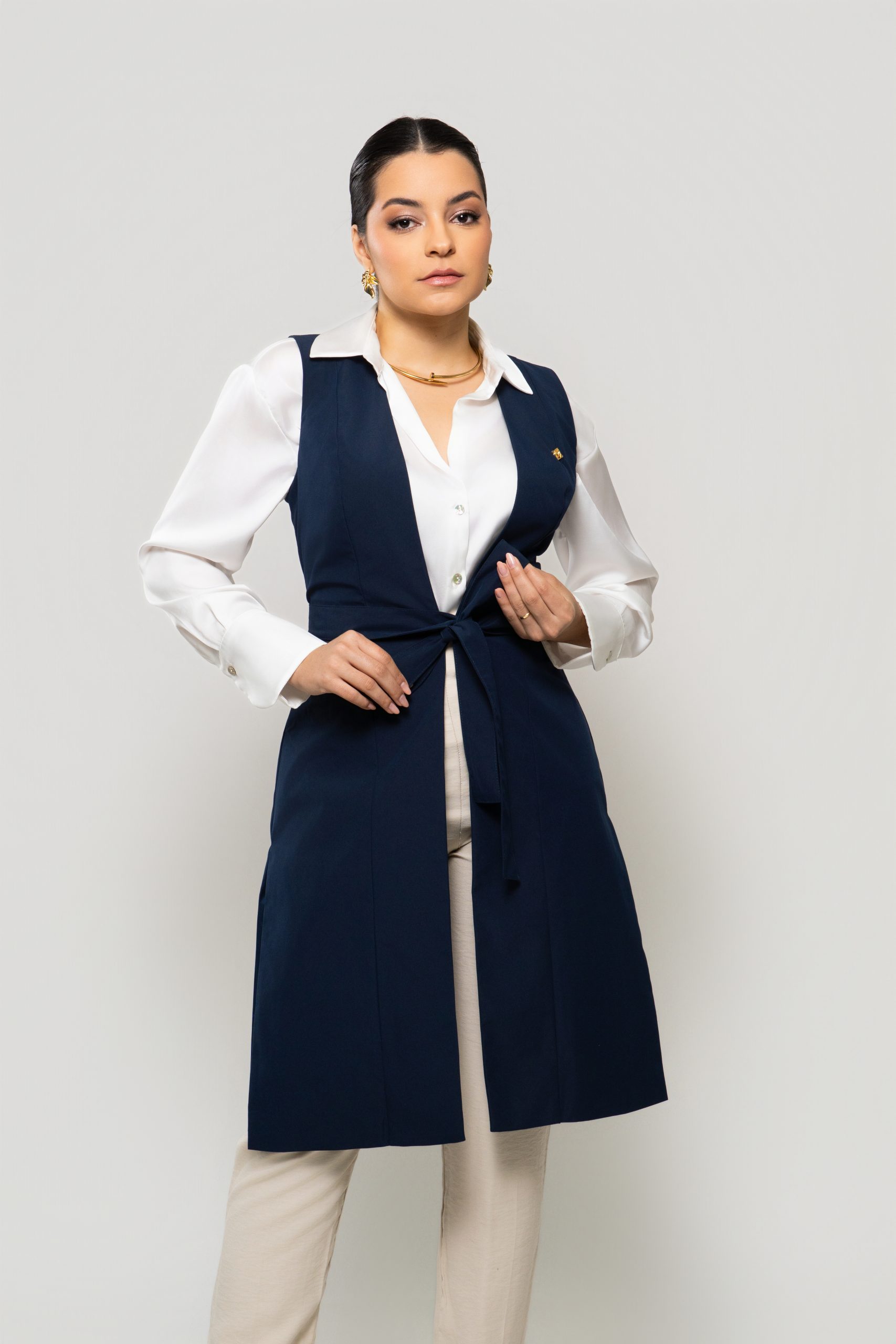 - Silhueta: Design de colete estilizado, com uma faixa ajustável na cintura que destaca a silhueta e permite criar um laço charmoso.