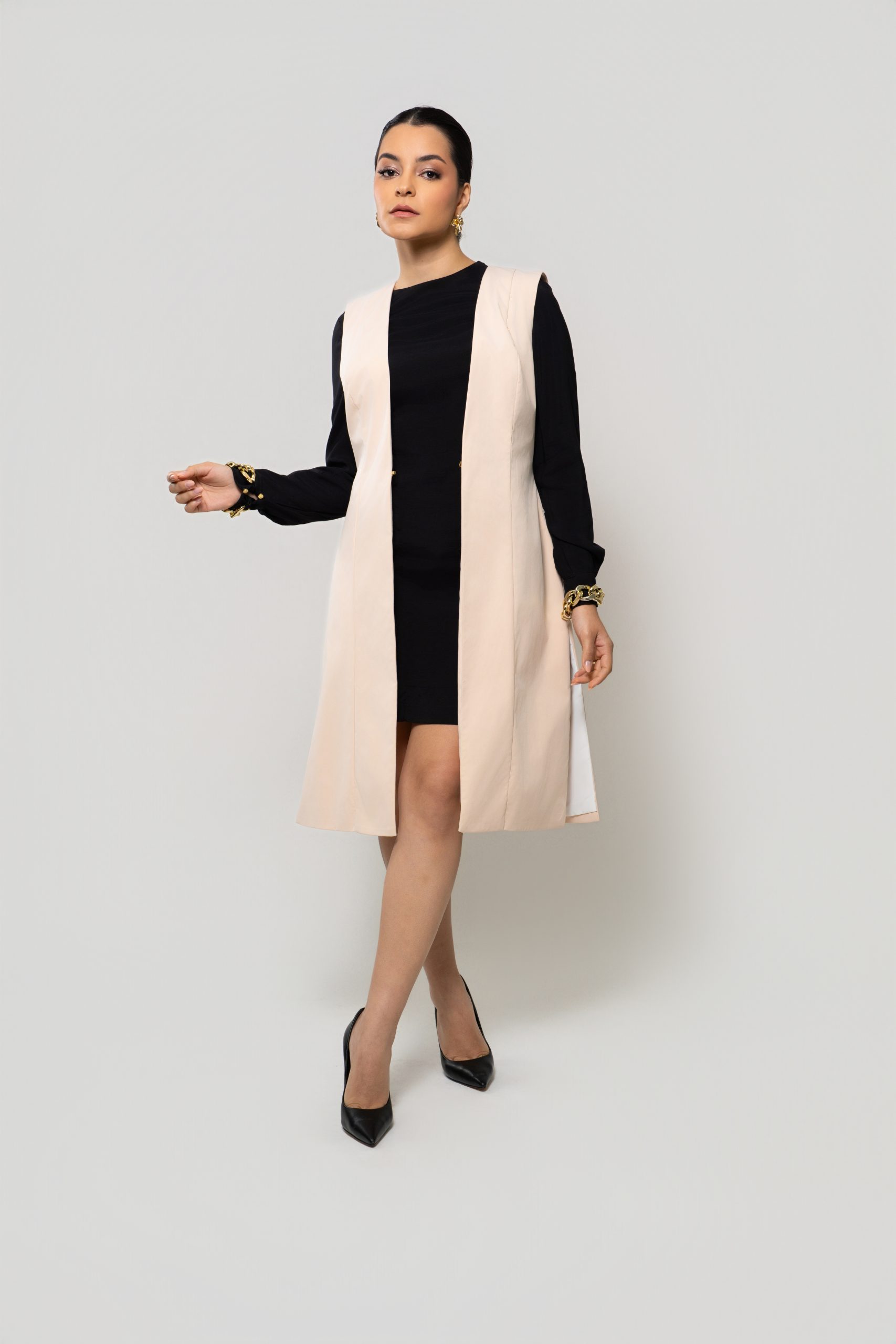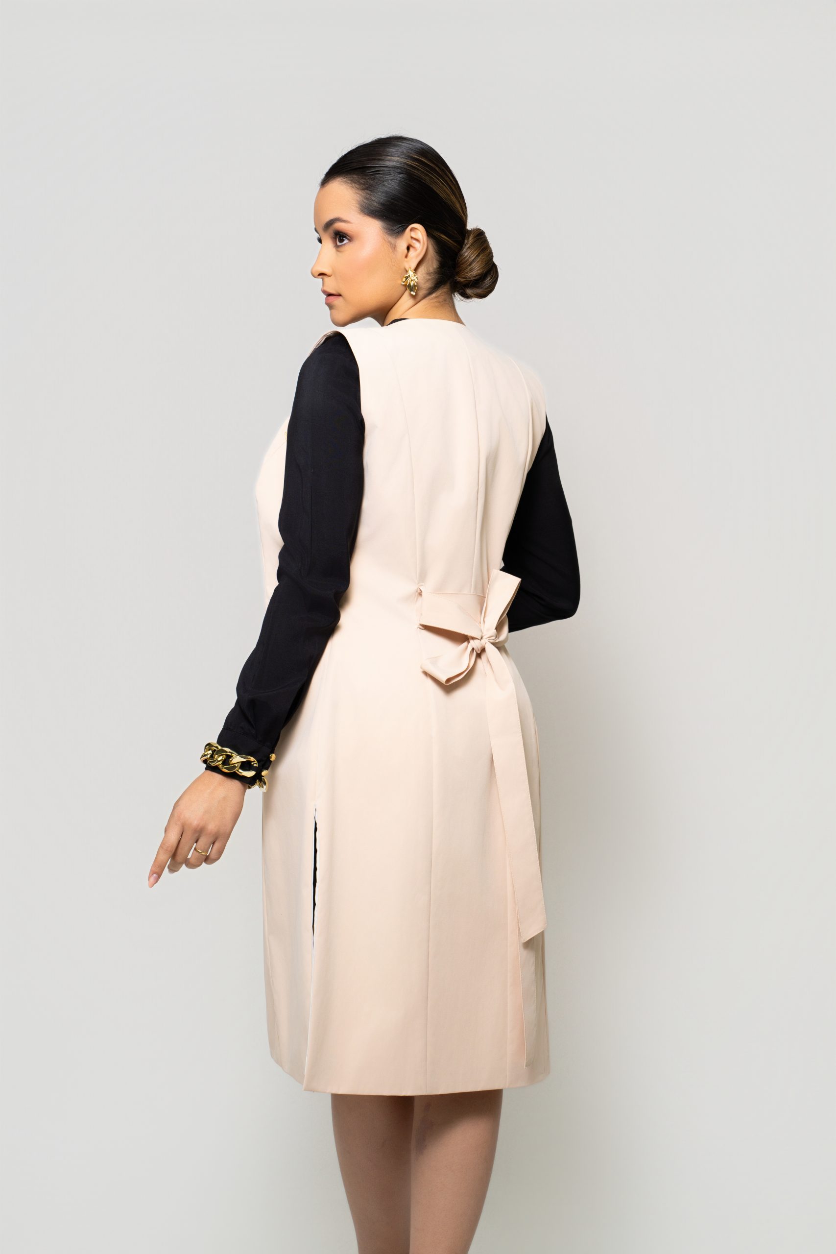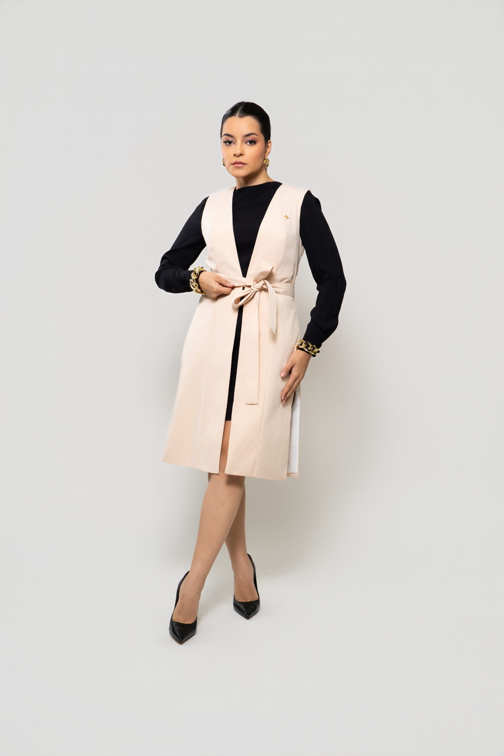 - Silhueta: Design de colete estilizado, com uma faixa ajustável na cintura que destaca a silhueta e permite criar um laço charmoso.