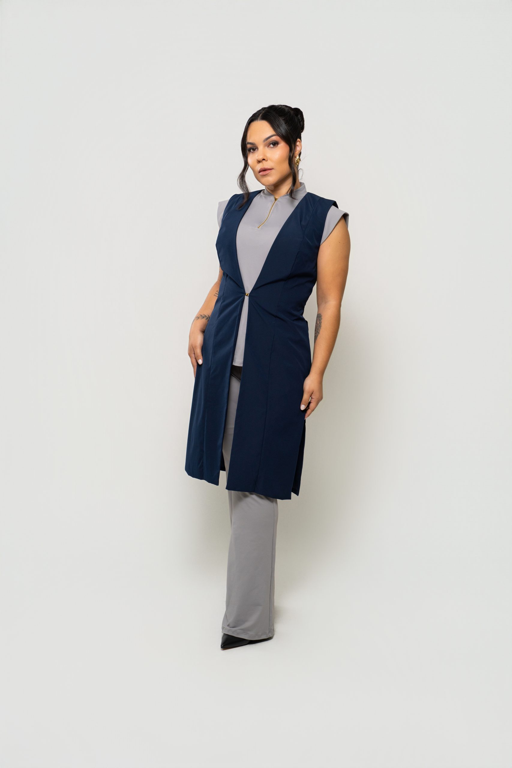 - Mangas: Sem mangas, ideal para sobreposição e liberdade de movimentos.